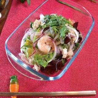 材料 緑豆春雨 100g 鶏ひき肉 250g 冷凍むきエビ 8~10尾 キクラゲ 1袋 紫タマネギ 1/2玉 パクチー 2枝 鷹の爪 1本 調味液 ライム3個orレモン 1個 ナンプラー 大さじ2 きび砂糖 大さじ1 キクラゲ...