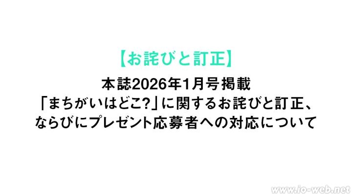 【お詫びと訂正、ならびにプレゼント応募者への対応について】 by h.h · 公開済み 2026年1月25日 · 更新済み 2025年12月25日 広告 本誌2026年1月号掲載「まちがいはどこ?」(70ページ)に誤りがありました。 本文中で「正解の上の絵に対し、下の絵には10カ所の間違いがあります」と記載しましたが、実際には間違いが16カ所あります。 読者の皆さまにご迷惑をおかけしましたことをお詫びし、訂正いたします。 なお、上記の誤りを踏まえ、今回のプレゼント応募における正解者は、間違いを10カ所以上見つけた方とさせていただきます。 月刊イオ編集部 シェアする