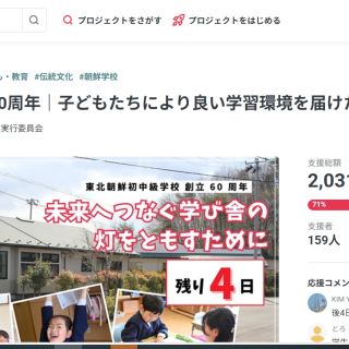 今年、創立60周年を迎える東北朝鮮初中級学校(宮城県仙台市)が子どもたちにより良い学習環境を届けることを目的にクラウドファンディングを実施中だ。 東北朝鮮初中級学校60周年記念事業実行委員会が「未来へつなぐ学び舎の灯をともすプロジェクト」と...